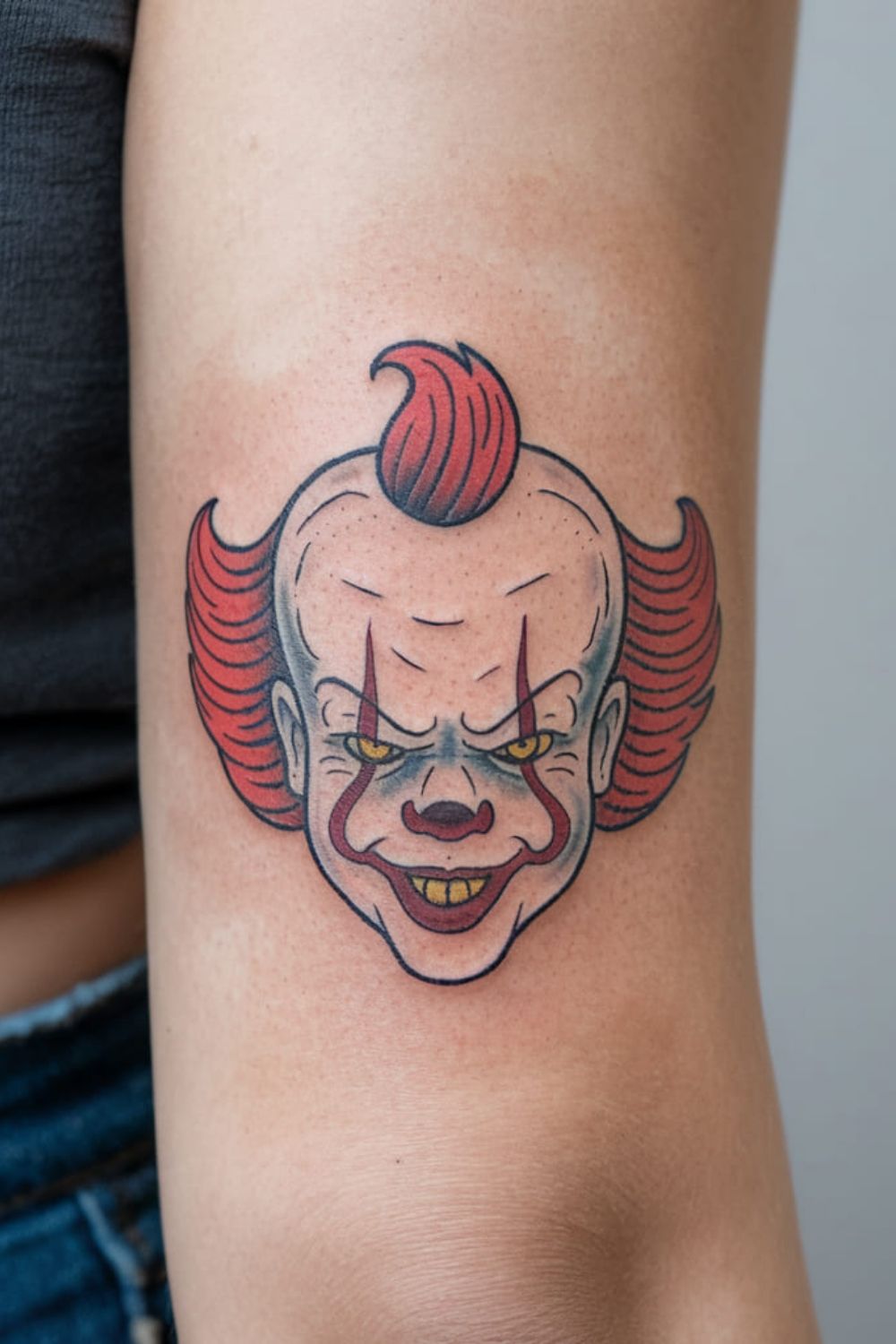 This tattoo goes straight for the throat in the best way. The exaggerated forehead, the razor-sharp stare, and that nasty little grin give it instant horror credibility, but the execution still feels polished and graphic instead of chaotic. The red hair and yellow eyes bring just enough color to make the face pop without overwhelming the design. It has that old-school monster energy people never really get tired of. If your taste leans bold, graphic, and unapologetically scary, this is the kind of clown tattoo that never needs an explanation.