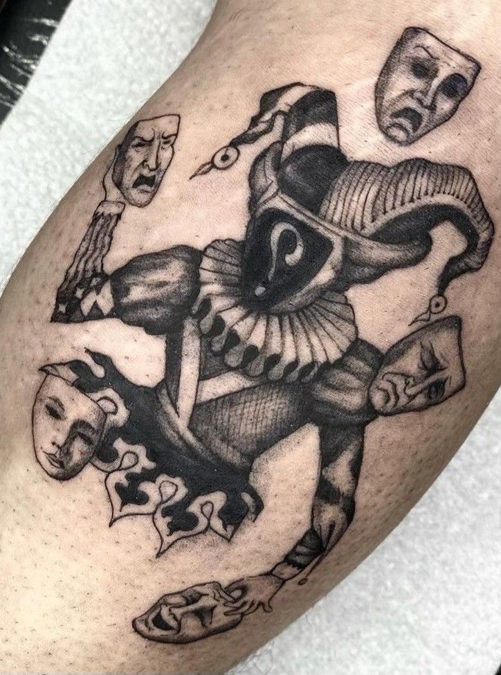 If you are deciding between a straightforward clown design and something more artful, this piece shows what makes the second option so compelling. The masks add storytelling, the black and grey keep it sophisticated, and the shape fits wonderfully on the thigh or calf. It is not the easiest tattoo to execute, though, so artist choice matters. Find someone skilled in blackwork and vintage-inspired detail if you want the full depth of this design to come through.