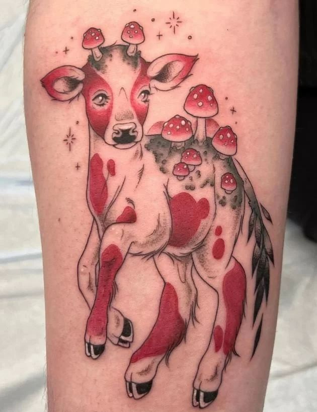 To keep this looking fresh, protect the reds: follow aftercare carefully, moisturize lightly, and be strict about sunscreen once healed because warm tones can fade faster. If you love cow tattoo ideas with color but want them to stay crisp, ask for clean linework and solid saturation. This is also a great design for women and men who want something cute with a little magical edge.