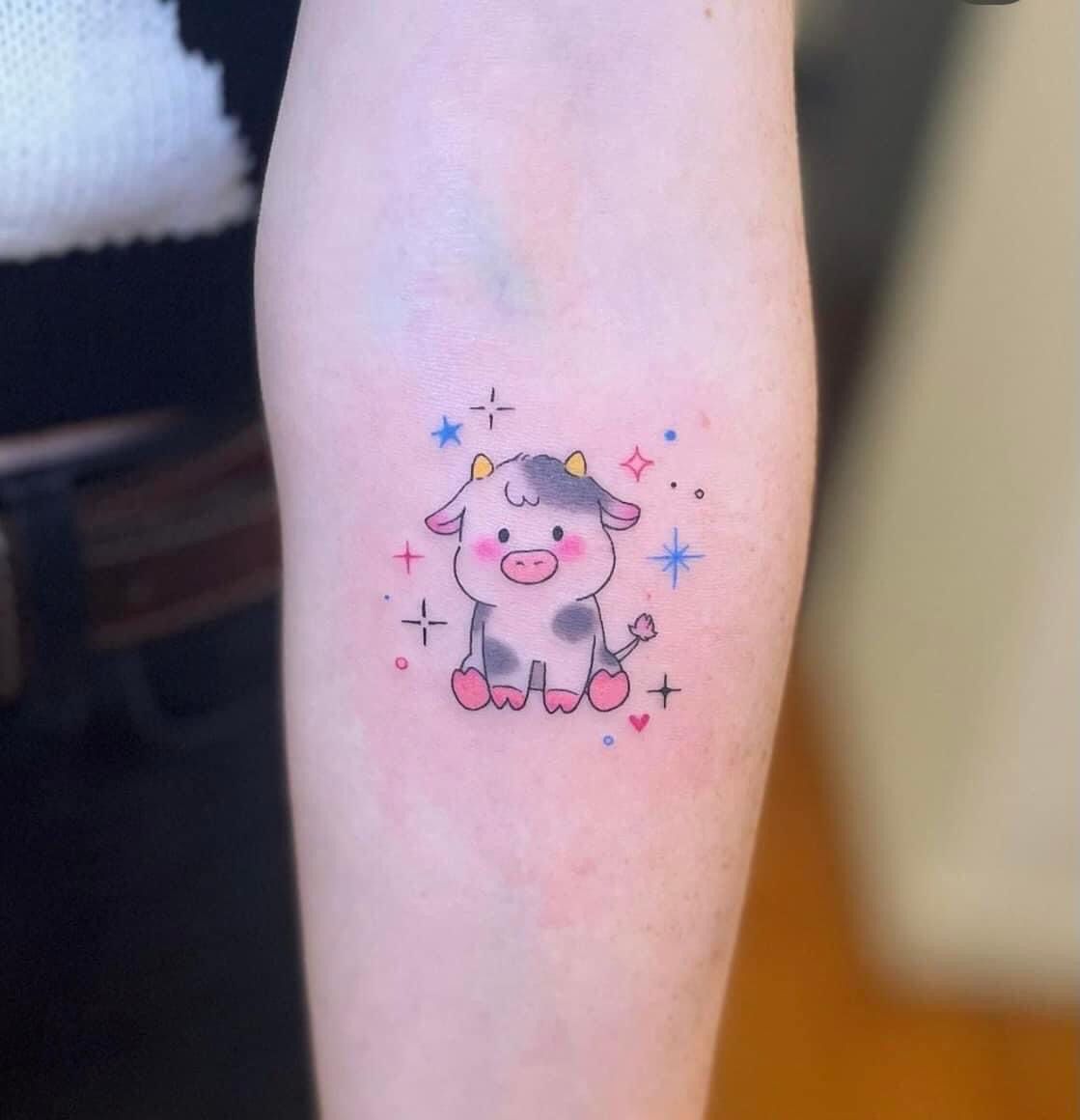 This one is pure serotonin. A tiny, big-eyed cartoon cow with little sparkles feels like the tattoo version of a happy text from a friend. It’s cute, lighthearted, and honestly kind of perfect if you want something that makes you grin every time you catch it in the mirror.
