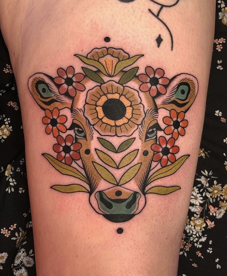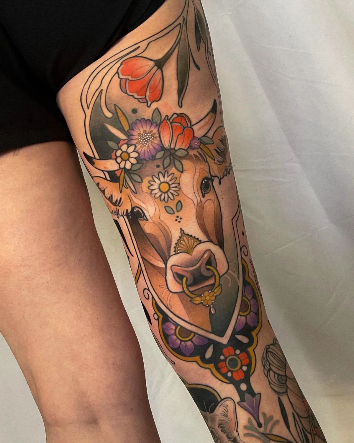 In 2025, this kind of traditional-inspired, graphic floral work is everywhere for a reason: it reads clearly, ages well, and looks amazing with both minimalist outfits and bold prints. If you like cow tattoo ideas that feel decorative and modern at the same time, this is a gorgeous design choice. Keep the lines strong and the colors well-packed so it stays vibrant and crisp.