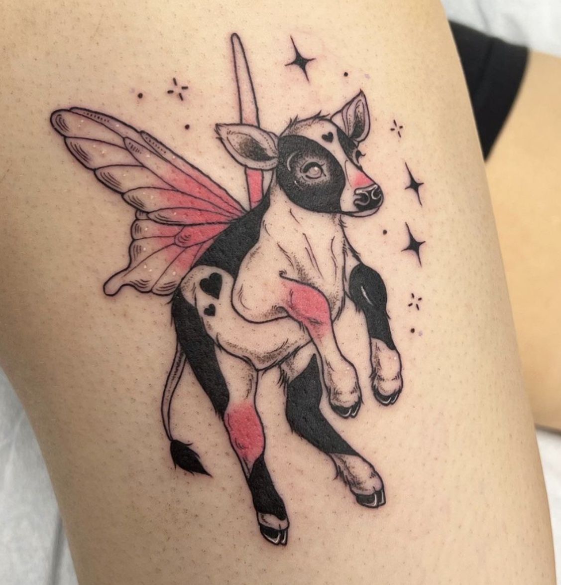 This is the kind of cow tattoo that feels like permission to be a little extra—in the sweetest way. Between the wings, the tiny sparkly accents, and that unicorn moment, it gives pure “soft girl with a backbone” energy. It’s whimsical without being childish, like you’re carrying your own pocket-sized fairytale and you’re not apologizing for it.