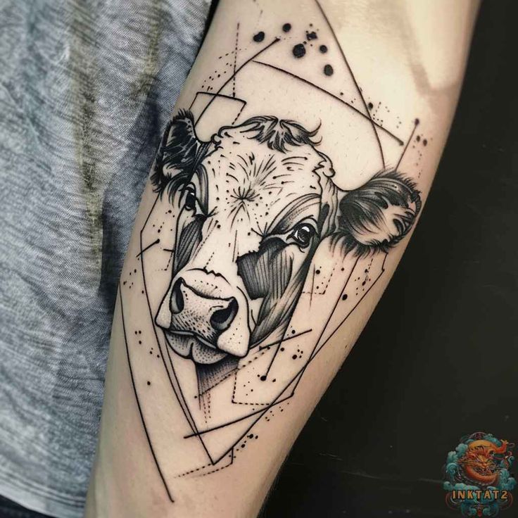 What makes this idea special is the contrast: soft realism inside a crisp shape. If you’re into cow tattoo ideas that feel mature and clean, this is a smart pick. It suits people who like simple layouts but still want detail, and it works beautifully in black and grey because the shading carries the emotion without needing extra elements.