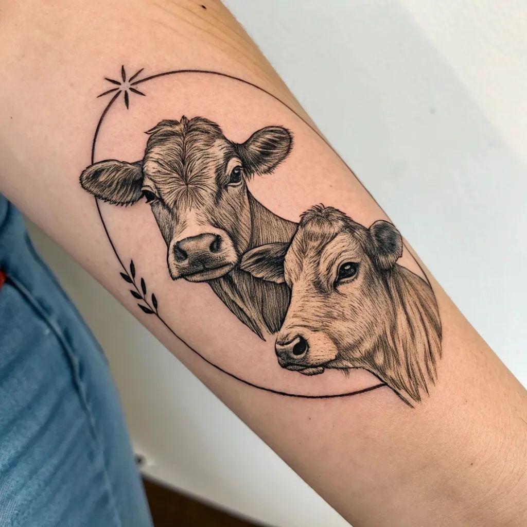 This is a beautiful option for women or men who want cow tattoo ideas with meaning but a clean, wearable look. The balanced composition works well on forearms and calves, and it’s especially perfect as matching ink for siblings, partners, or best friends. If you prefer a simple design, ask your artist to keep the frame crisp and the shading soft so the faces stay readable for years.