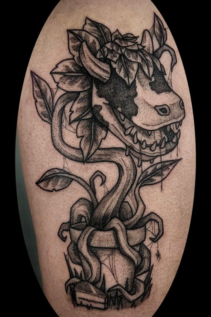 What makes this design special is how it blends two worlds: organic florals with strong, shadowy structure. It’s more than “a cow tattoo”—it’s a statement piece, so it works best when you give it space on the thigh, calf, or upper arm. If you love cow tattoo ideas that feel unique and a little gothic, this is a showstopper without needing color.