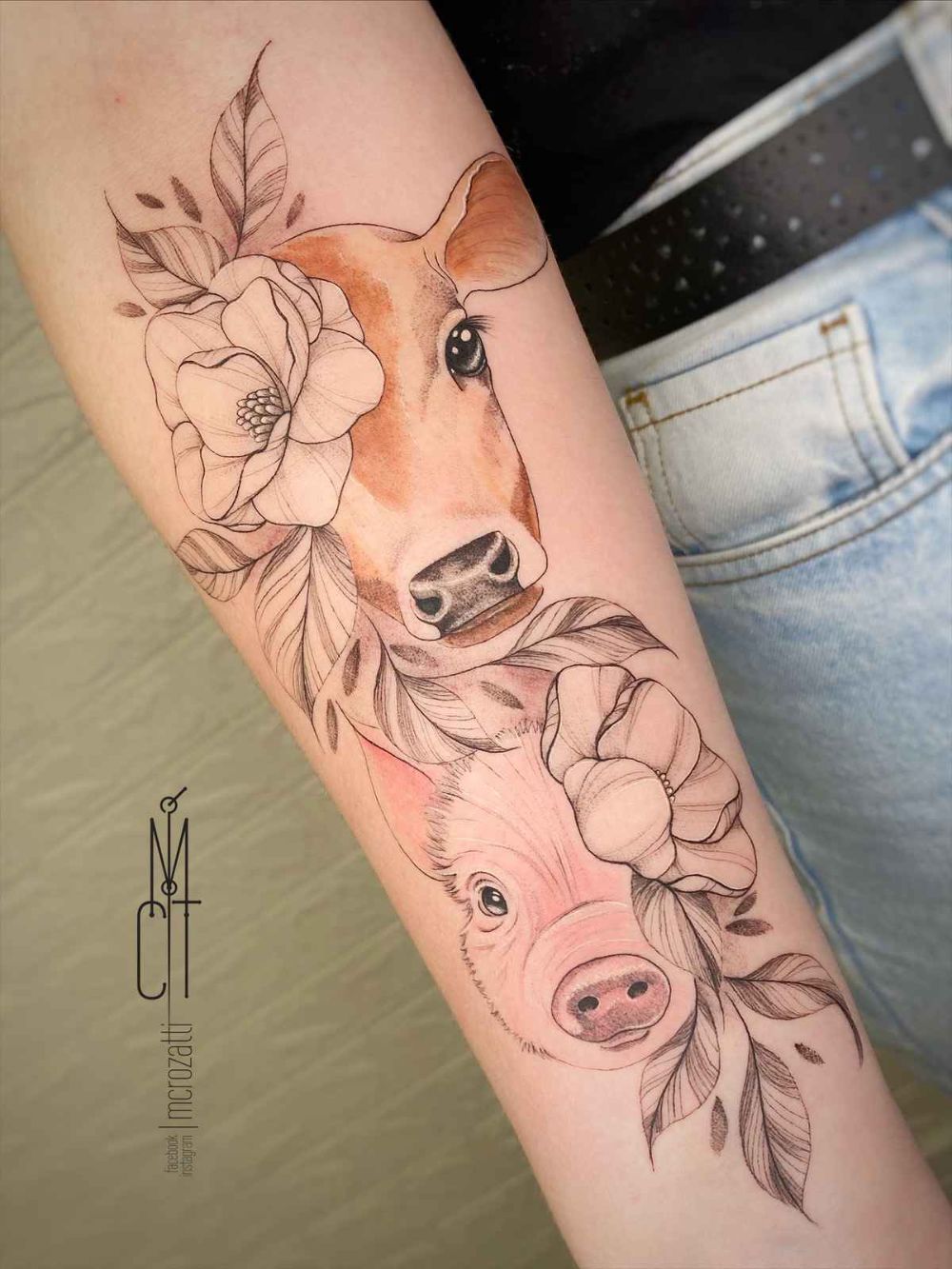 If you love styling your tattoos like part of your overall look, this one pairs beautifully with delicate jewelry and a clean, elevated wardrobe—think gold hoops, a soft lip, and cozy knits. A fine-line approach keeps the flowers graceful, so ask your artist for light shading and crisp outlines. It also makes a gorgeous matching idea if you and a loved one want coordinated cow tattoo ideas without doing identical pieces.