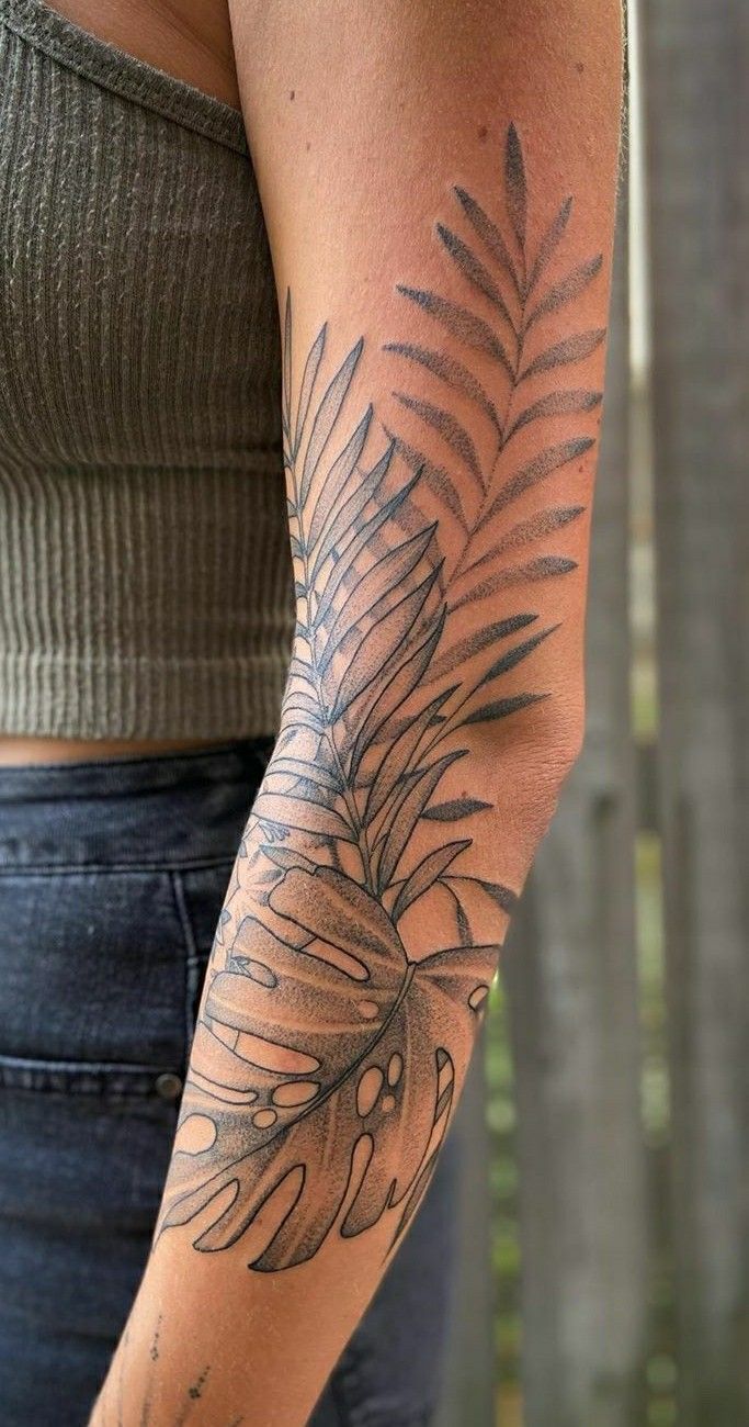 Okay, this is the “I book the trip and I look amazing doing it” tattoo. Big, graphic leaves stack together like a luxury wallpaper print—dramatic, clean, and seriously flattering on the arm. The Monstera shapes feel modern and artsy, and the palm fronds add movement, like a warm breeze running over your shoulder.
