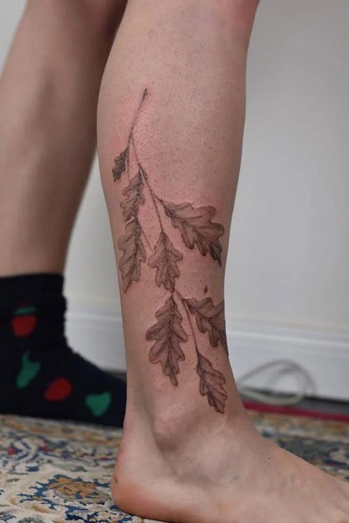 This oak leaf tattoo feels wise, steady, and quietly confident—the kind of design that speaks to lived experience rather than trends. The intricate texture inside the leaf almost looks like a stitched fabric or mosaic, giving it depth and soul. It carries an autumn mood without leaning overly rustic, making it feel modern yet deeply rooted.