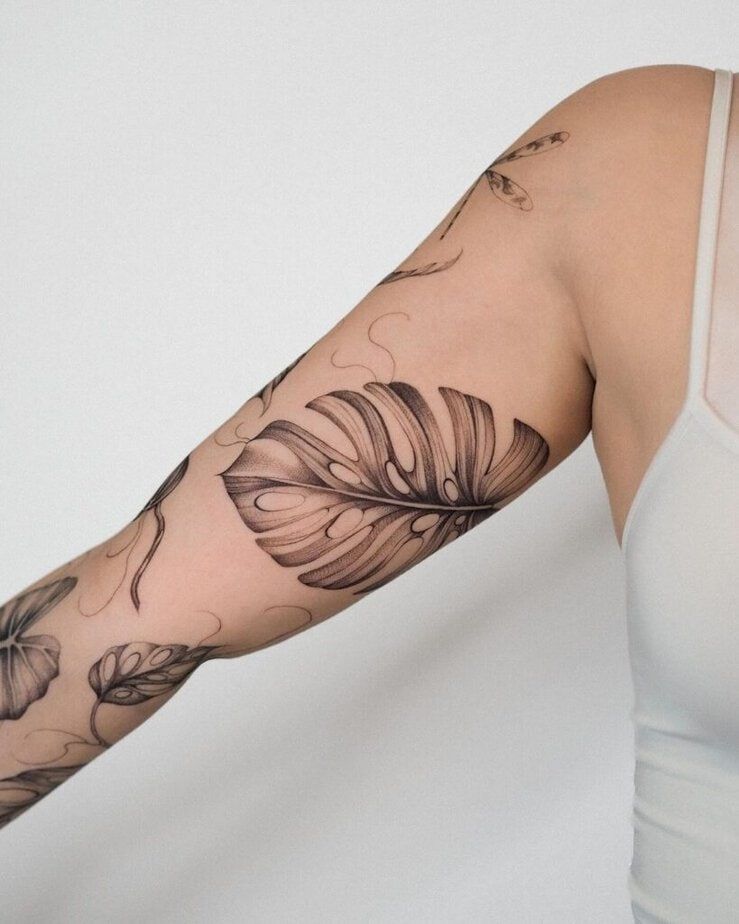 This sleeve-style Monstera tattoo feels like wearable art. The scale alone makes it powerful, but the soft shading keeps it approachable rather than overpowering. It tells a story of growth, patience, and connection to nature.