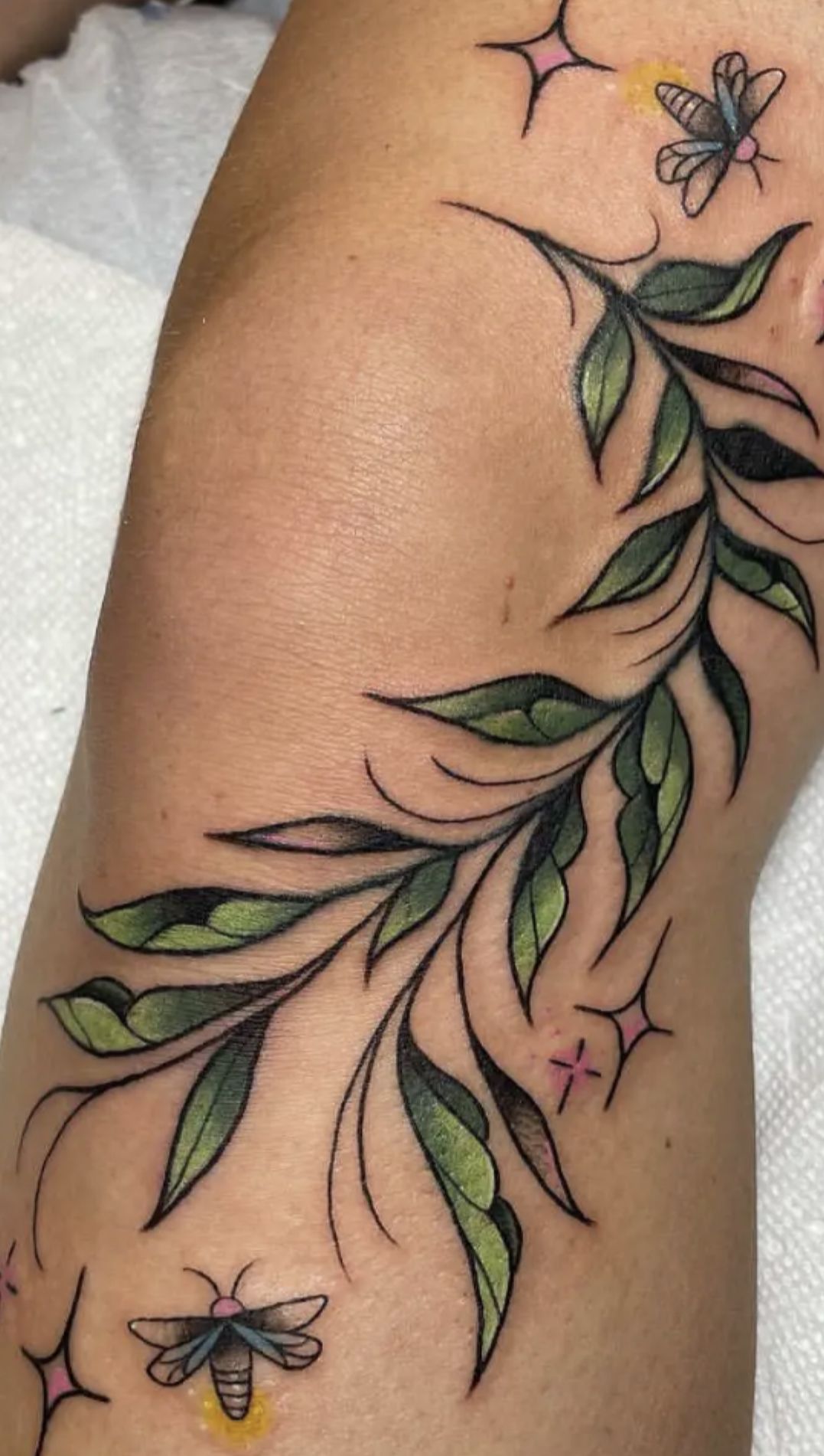 This one is playful in the best way—like you’re carrying a little pocket of summer with you. The flowing branch and green leaves feel breezy, and the tiny bees add this sweet, animated energy without turning it into a cartoon. The little star-like accents give it a “made for you” charm, the kind of tattoo that makes strangers smile when they catch it.