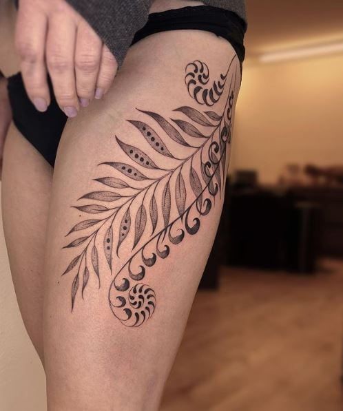 This tattoo stands out for its uniqueness and works best on the thigh or arm, where the curves enhance the design. It’s a great option for those who want a leaf tattoo that feels artistic rather than literal, offering a confident, creative edge that feels very now.