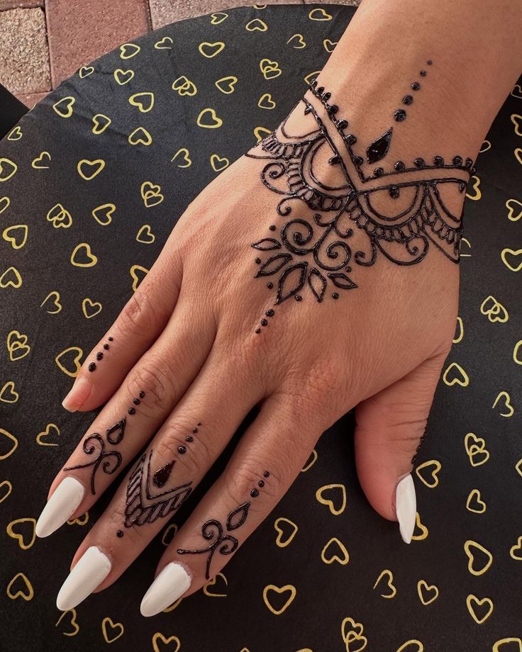 This design feels like wearing delicate lace jewelry—but painted directly onto your skin. The ornamental band wrapping around the wrist with detailed finger accents gives off a subtle Traditional vibe, yet it still feels modern and refined. It’s intricate without being overwhelming, which makes it feel incredibly wearable.