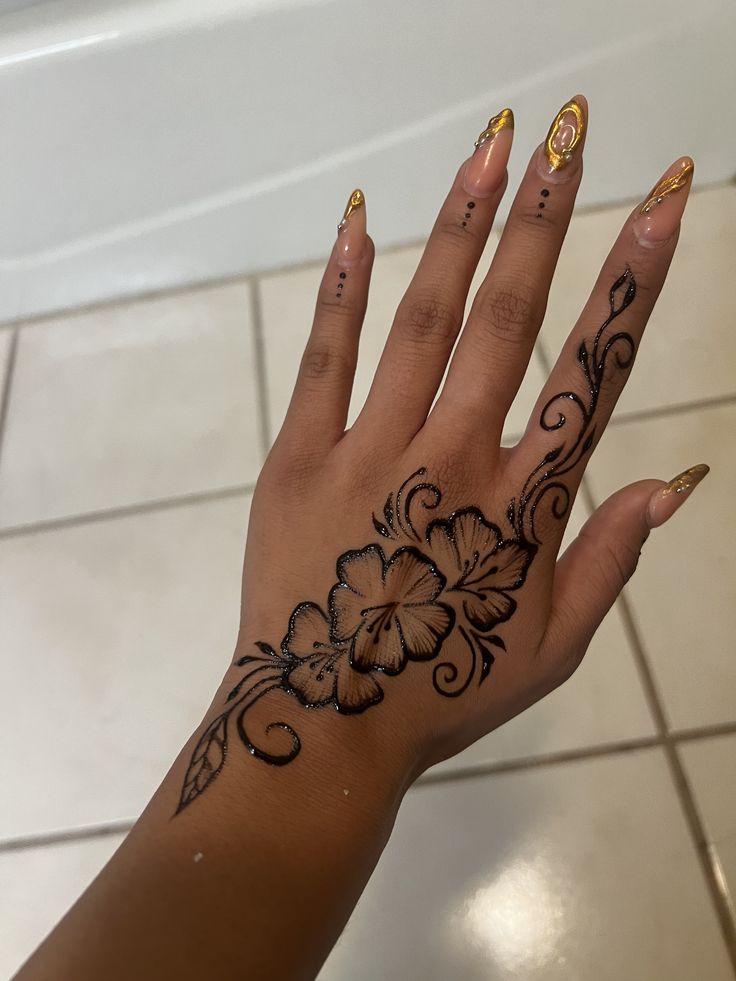 There’s something effortlessly feminine about a flowing Flower vine that stretches across the hand and dances toward the fingers. This design feels romantic but not overdone—like slipping into your favorite sundress on a warm Summer evening. The soft petals paired with delicate swirls create a Hand aesthetic look that feels polished, confident, and quietly bold at the same time.