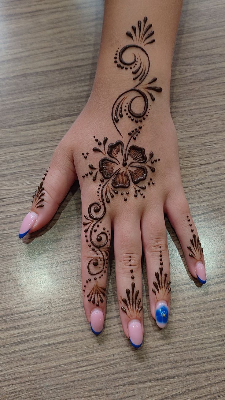 If you’re new to henna or prefer something easy to maintain, this simple option is ideal. It complements both long and short nails and works beautifully for everyday wear. You can even adapt it to a simple front-hand layout for a softer, more subtle statement.