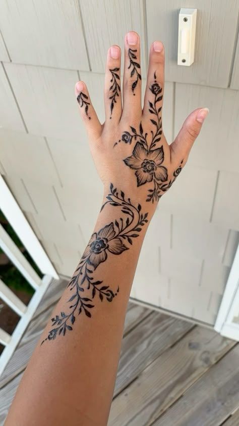 This design feels confident—like you’ve decided to take up space in the best way. The larger Flower motif flowing from the hand toward the forearm creates movement and drama without feeling heavy. It’s artistic, feminine, and just a little daring.