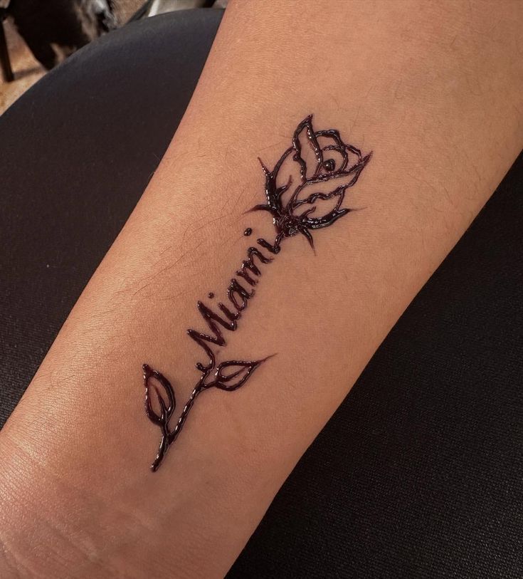 This rose with flowing script feels deeply personal—almost like carrying a message close to your heart. The elegant Flower combined with lettering gives it a meaningful, customized vibe.