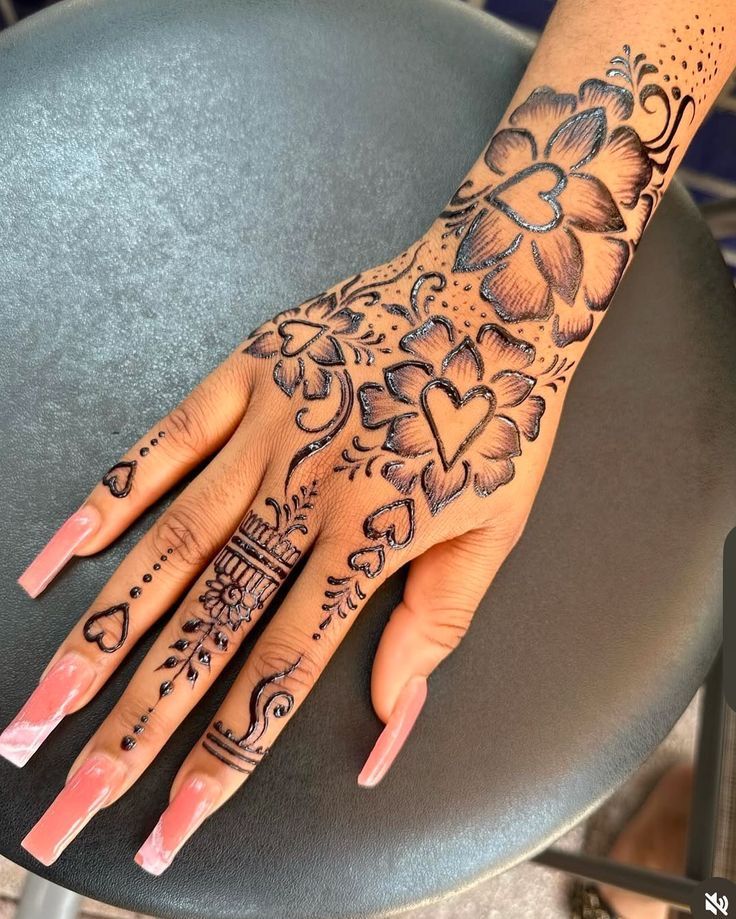 This design feels romantic and playful, with heart-shaped accents woven into blooming Flower motifs. Flowing from the hand toward the forearm, it creates movement that feels both feminine and expressive.