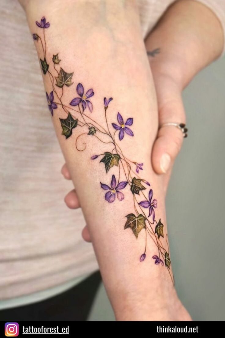 This ivy tattoo feels like a tiny stretch of countryside captured on skin, where delicate purple flowers mingle naturally with curling greenery. The flowing composition gives it a gentle storytelling quality, almost like a memory pressed between the pages of a favorite book. It feels feminine without trying too hard, soft but still full of quiet personality.