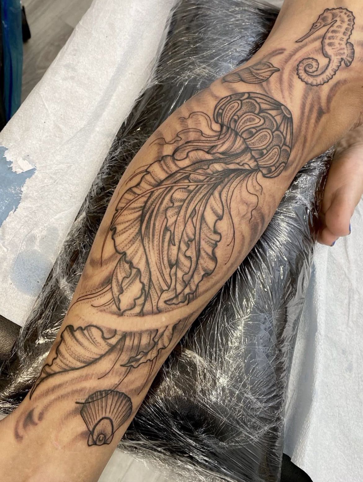 Jellyfish have this hypnotic elegance, don’t they? The way they drift feels almost spiritual. This sleeve underwater composition wraps around the arm with graceful flow, accented by shells and soft shading. It feels feminine, artistic, and quietly powerful all at once.