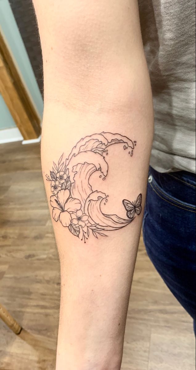 There’s something so refreshing about a single curling wave paired with soft florals and a tiny butterfly. It feels like a gentle reminder that life moves in cycles—sometimes powerful, sometimes delicate. This is one of those ocean tattoo ideas that feels Cute and Dainty without losing its emotional depth.