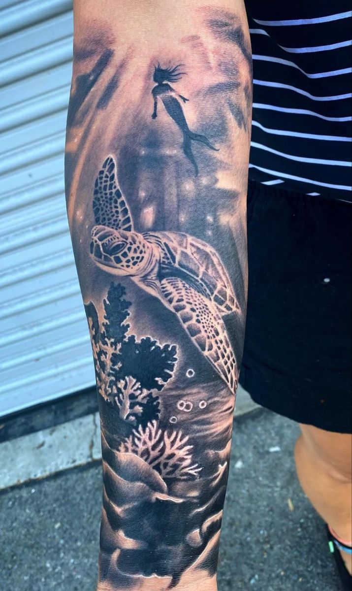 This design feels like stepping into another world—sunlight filtering through water, coral swaying gently, and a sea turtle gliding in total peace. There’s a quiet emotional pull to underwater realism, almost meditative, reminding you to slow down and breathe. It’s the kind of tattoo that invites people to look closer and stay a little longer.