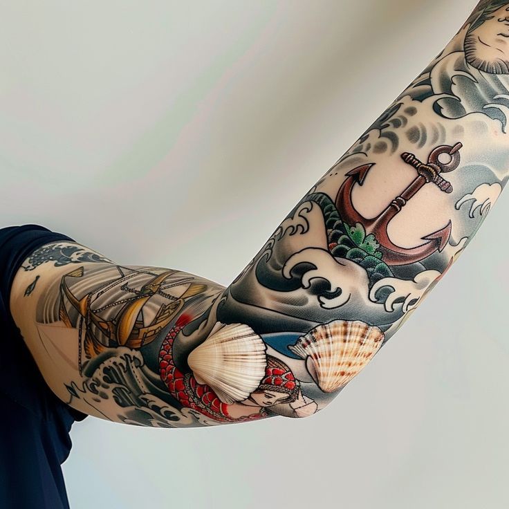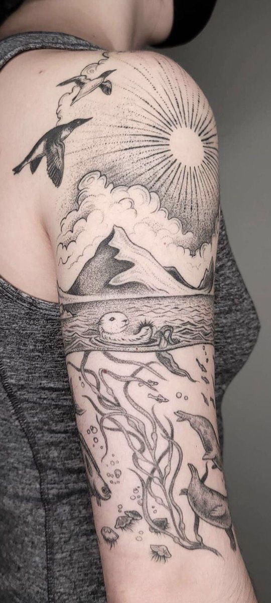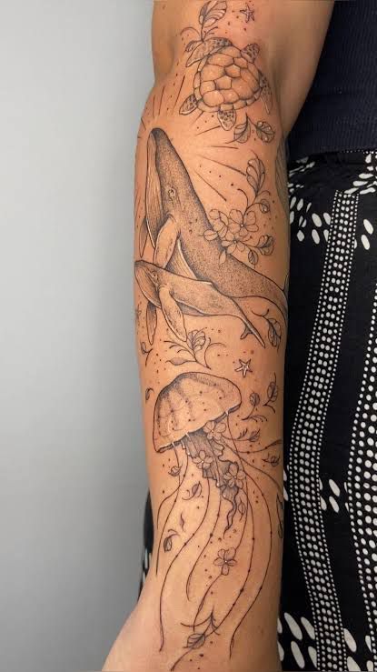 Designs like this are perfect for women and men who love intricate sleeve or arm tattoo ideas with meaning. The detailed fine-line shading keeps the look elegant rather than heavy, making it a beautiful choice for anyone drawn to aesthetic ocean scenes that feel both natural and artistic.