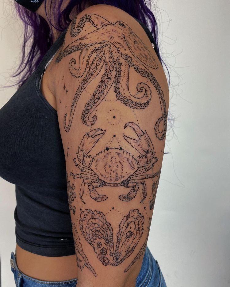 This full ocean sleeve feels like stepping into a tide pool at low tide—octopus tentacles curling, a crab standing strong, shells resting below. It has that slightly mysterious, slightly bold underwater mood that feels rich and layered. Definitely not shy, and honestly, why should it be?