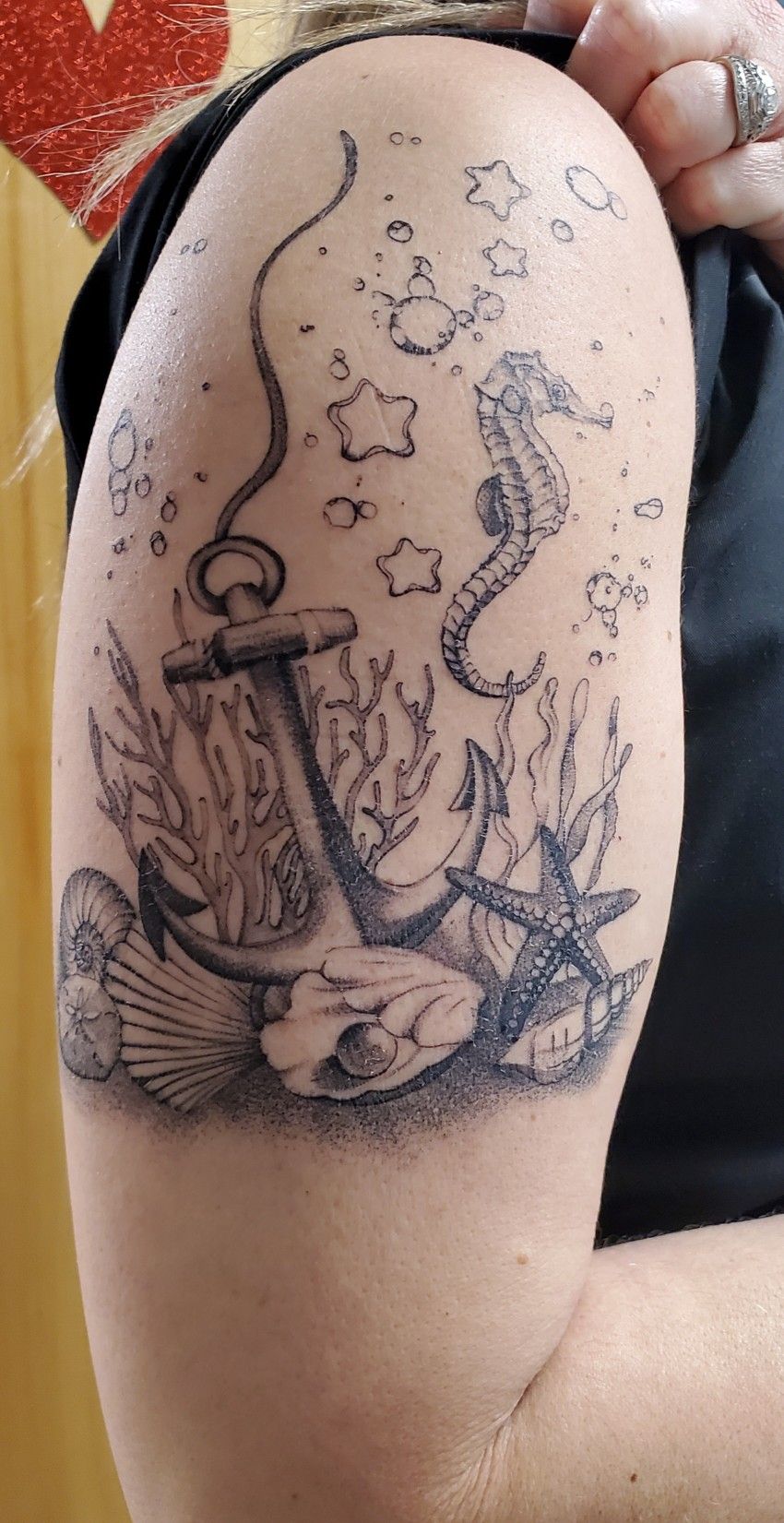 There’s a gentle storytelling quality in this delicate ocean collage. The seahorse feels whimsical, the shells nostalgic, and the anchor quietly symbolic—like memories collected during meaningful moments in life. Everything is balanced and calm, giving the tattoo a soft emotional warmth rather than dramatic intensity.