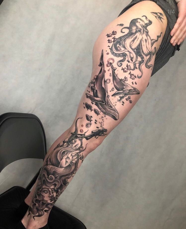 A sleeve underwater composition like this is perfect for bold personalities ready for large-scale storytelling. It works beautifully as a sleeve for a woman’s leg or for men wanting immersive realism, especially if you love tattoos that reveal new details every time you look.