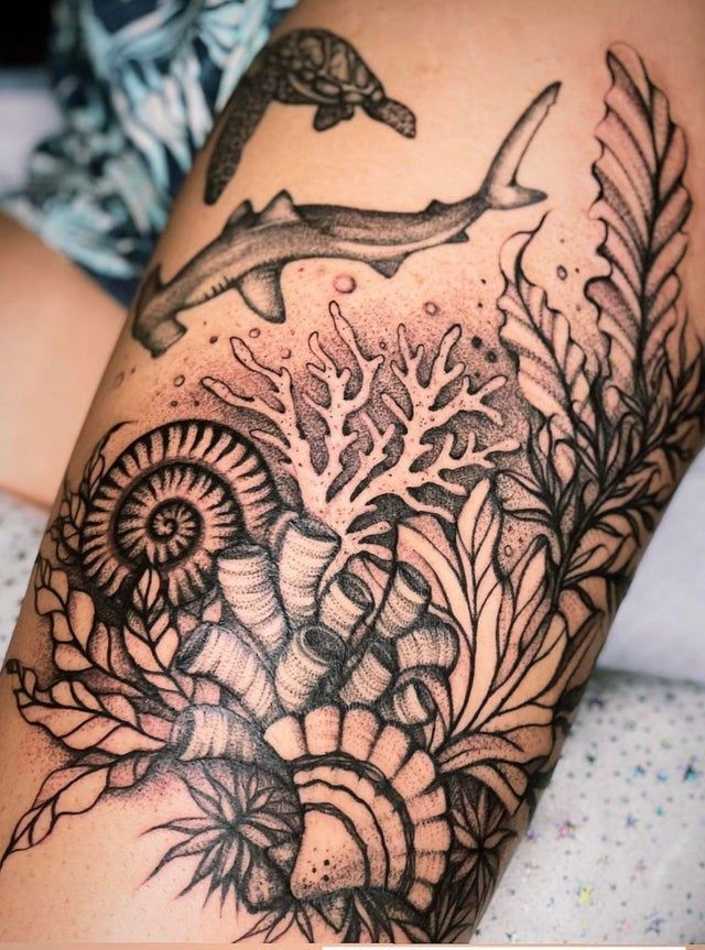 If you’re ready for a statement sleeve, this is one of those ocean tattoo ideas that commands attention. It works beautifully as a sleeve for women who love intricate detail and storytelling. The fine line technique keeps it from feeling too heavy, making it wearable despite its size.
