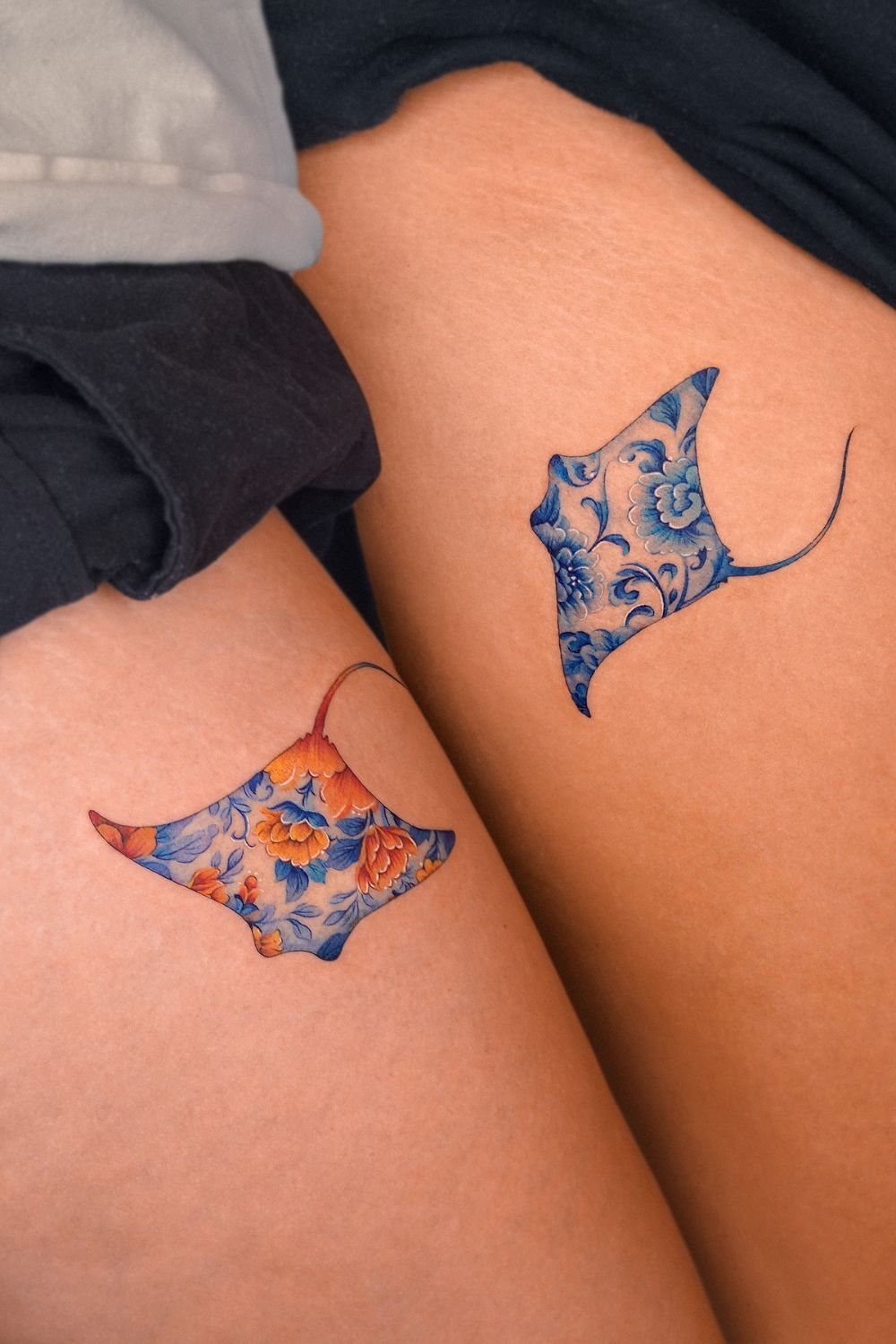 Now this one makes my heart smile — Matching manta rays filled with intricate floral patterns. It feels artistic and slightly playful, almost like wearable porcelain art. There’s something very aesthetic about the balance of blue tones and symmetrical placement. It’s ocean-inspired but with a creative twist.