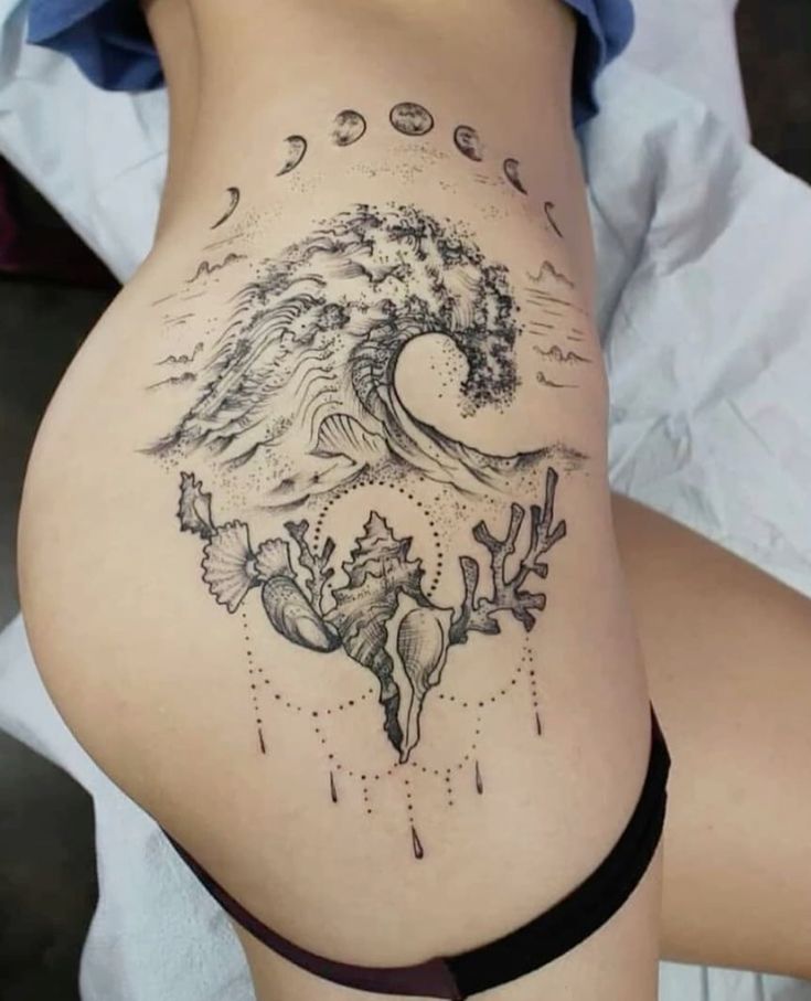 This Moon and wave composition placed on the back or side of the body feels mystical and feminine. The phases above the crashing wave add a cosmic rhythm that fills the whole piece with meaning. It’s dramatic yet graceful—like honoring both the ocean and the sky.