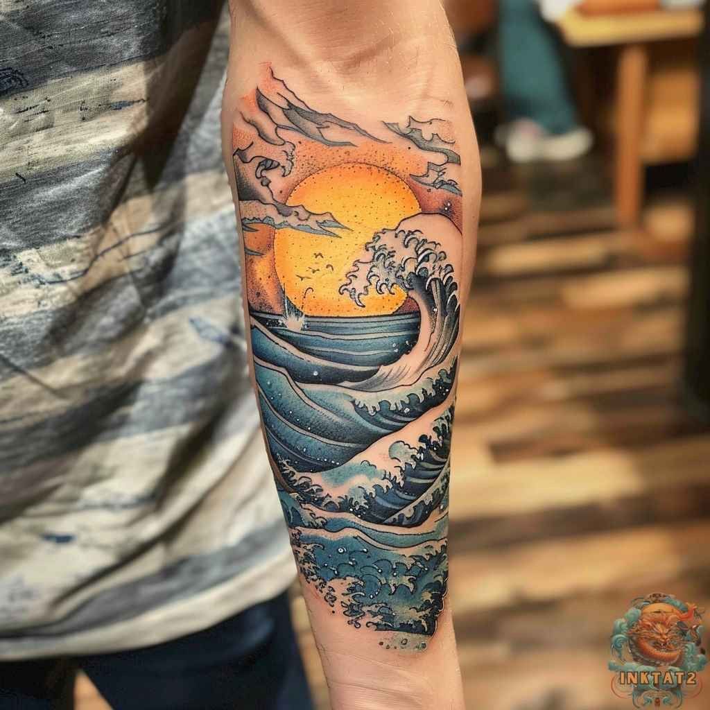 Bold colors and rolling waves create instant warmth here, like watching the sun sink into the sea at the end of a perfect day. The movement feels energetic yet comforting, blending nostalgia with adventure. It’s the kind of tattoo that radiates positivity every time you see it.