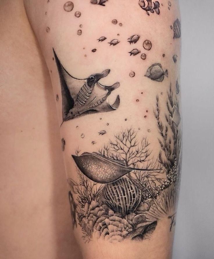 There’s something almost meditative about this delicate underwater composition. A graceful stingray glides above coral and tiny fish, surrounded by soft bubbles that make the whole piece feel light and alive. It’s the kind of ocean tattoo design that whispers rather than shouts—quiet, thoughtful, and deep with meaning. I love how it captures that dreamy moment when you’re snorkeling and everything slows down.