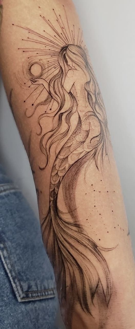 Fine line tattoos like this are trending because they feel delicate yet meaningful. This piece works beautifully on the forearm, where the vertical glow of the halo elongates the silhouette. If you’re searching for siren tattoo ideas that feel peaceful and symbolic, this one is deeply inspiring.