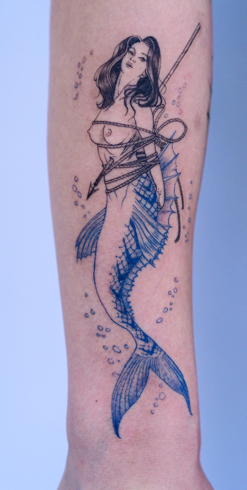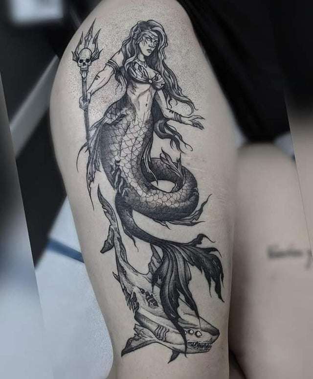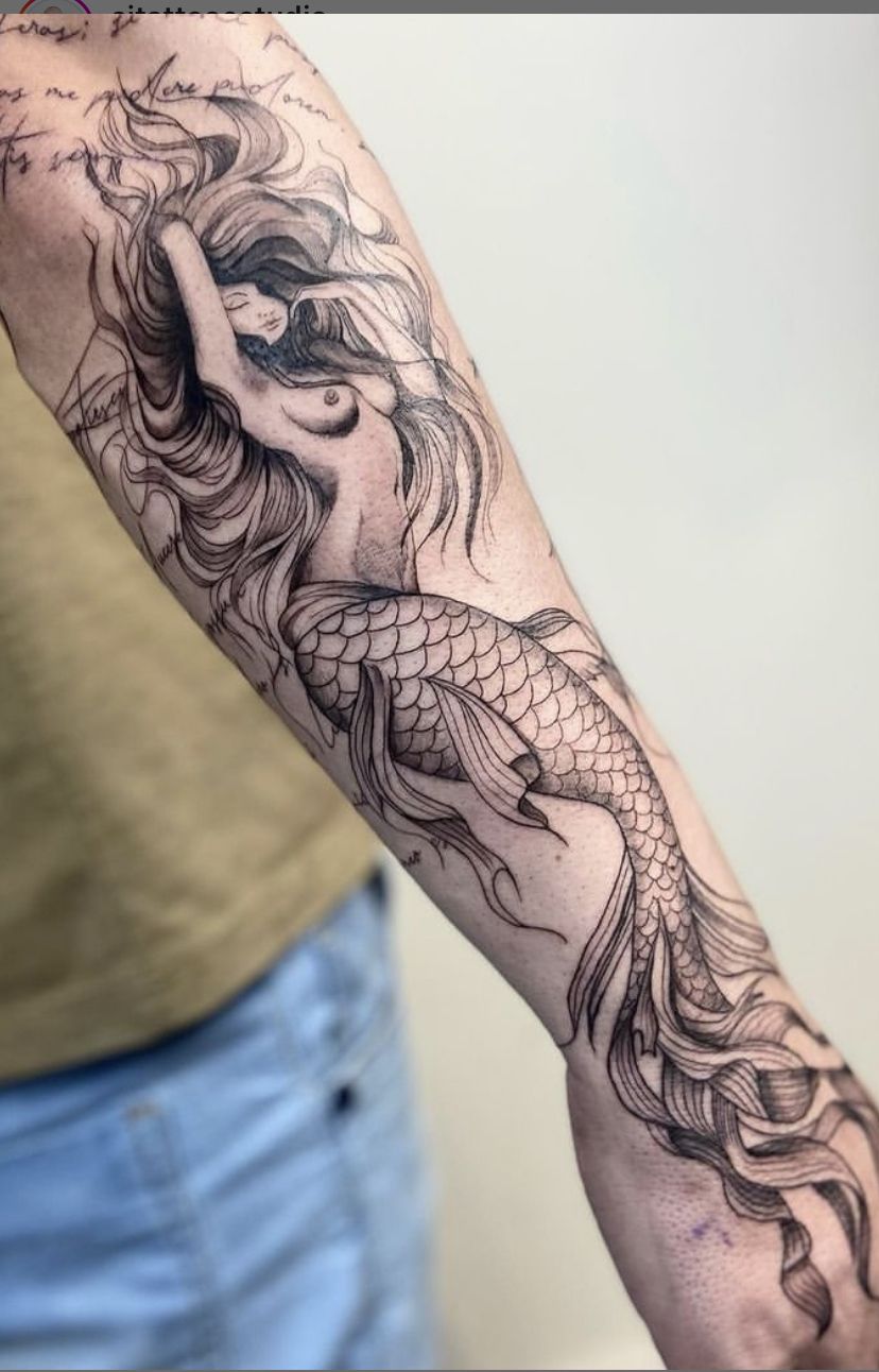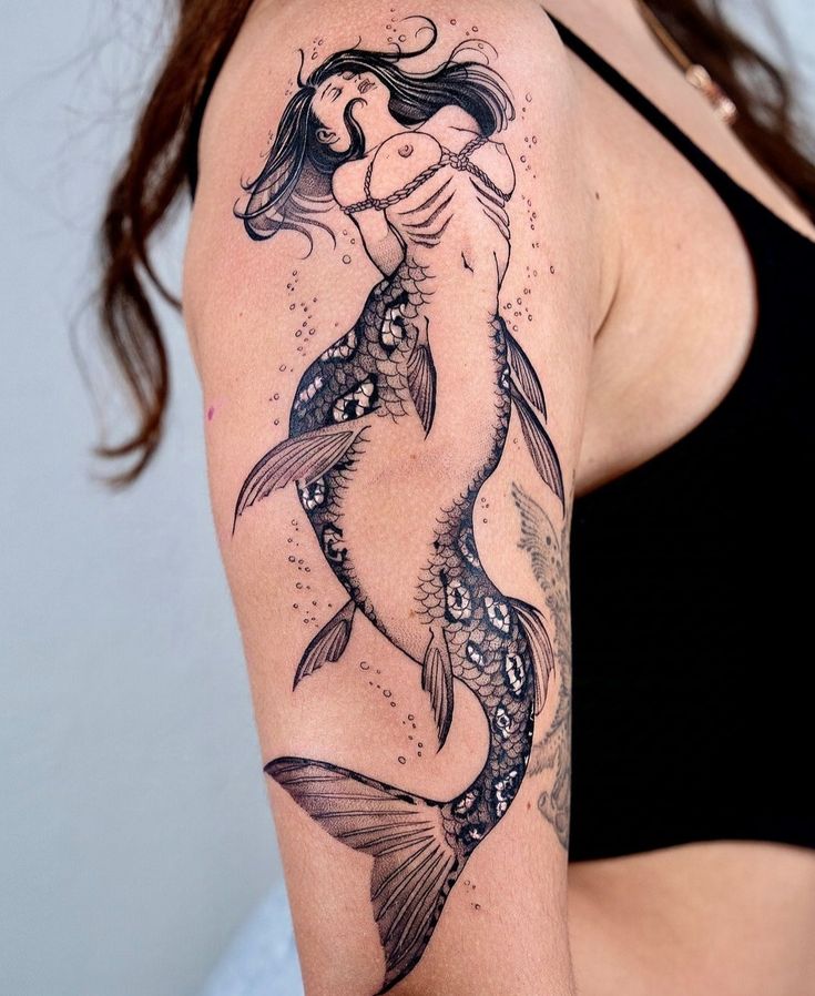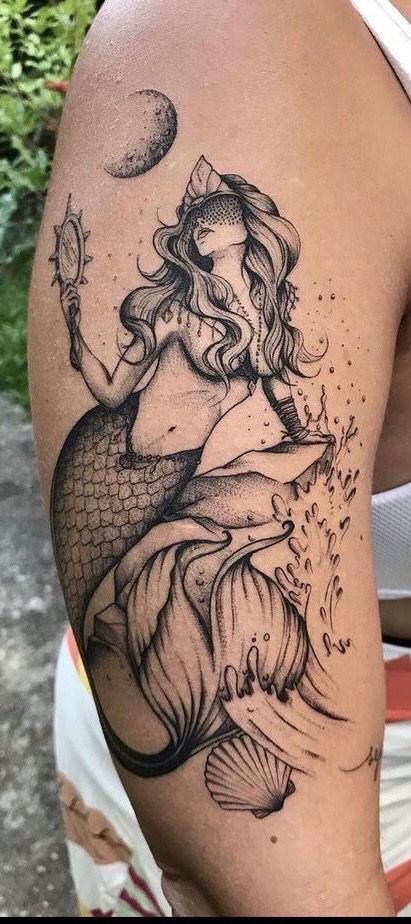 This tattoo is ideal for those who want a powerful sleeve or upper-arm piece. Compared to softer siren designs, this one leans heavily into strength and action. It’s a great option if you see the Mermaid not as a muse, but as a protector or warrior figure.