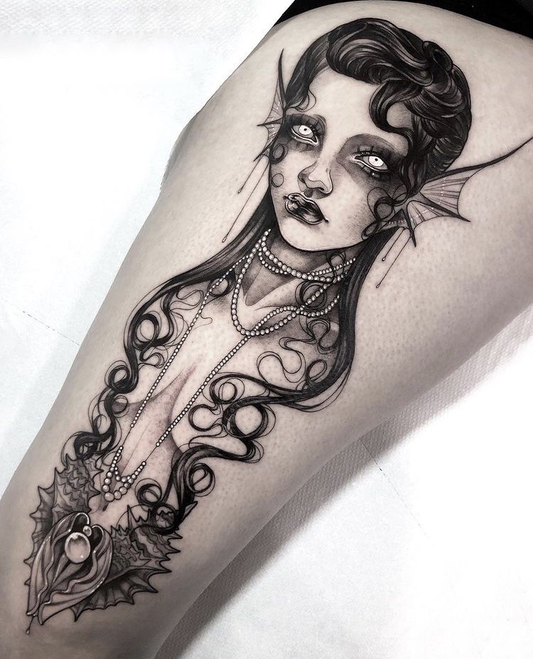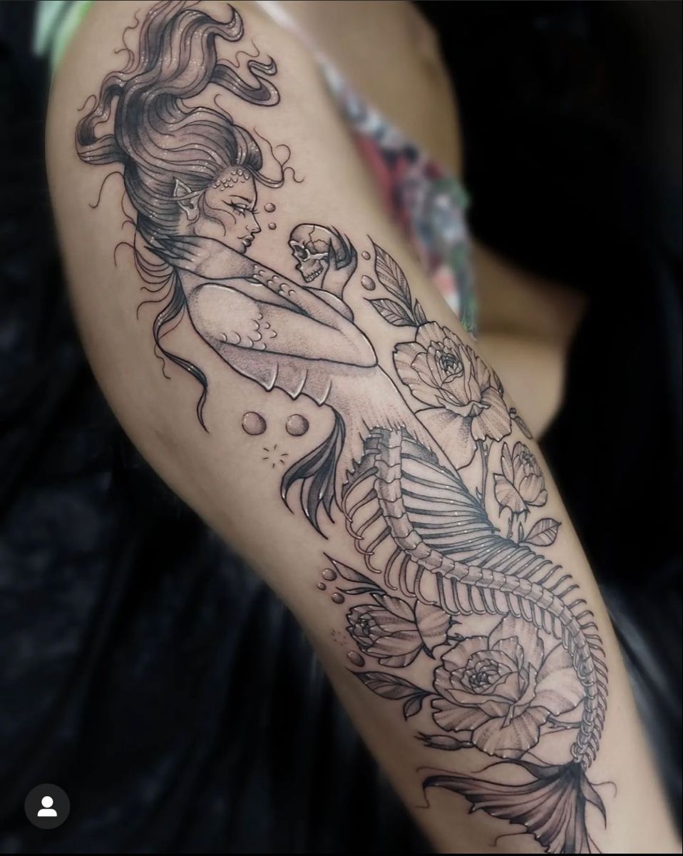 For anyone drawn to statement tattoos, this design works best on the thigh or calf, where the movement of the tail can fully shine. It’s especially flattering for women who love dramatic art and aren’t afraid of attention. Compared to softer siren ideas, this one feels fearless and modern, perfect if your style leans toward goth glamour with a confident edge.