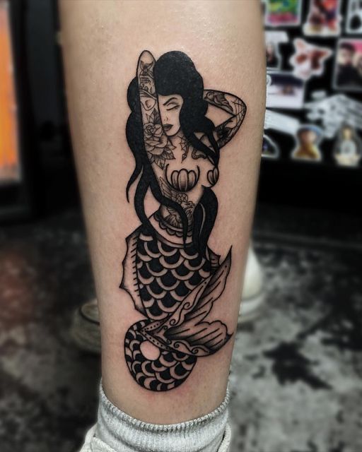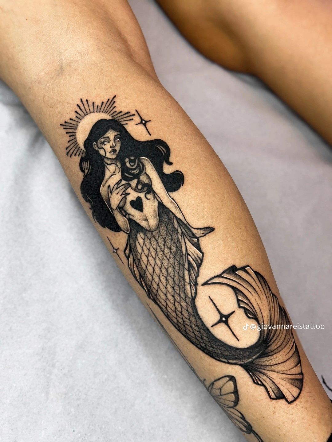 Because of its traditional balance and clear line work, this design works beautifully for women who love tattoos that age gracefully. The calf or forearm placement keeps the silhouette elegant and easy to show or hide. Compared to more detailed modern siren tattoo ideas, this one stands out for its simplicity and long-term durability, making it a smart and stylish lifelong choice.