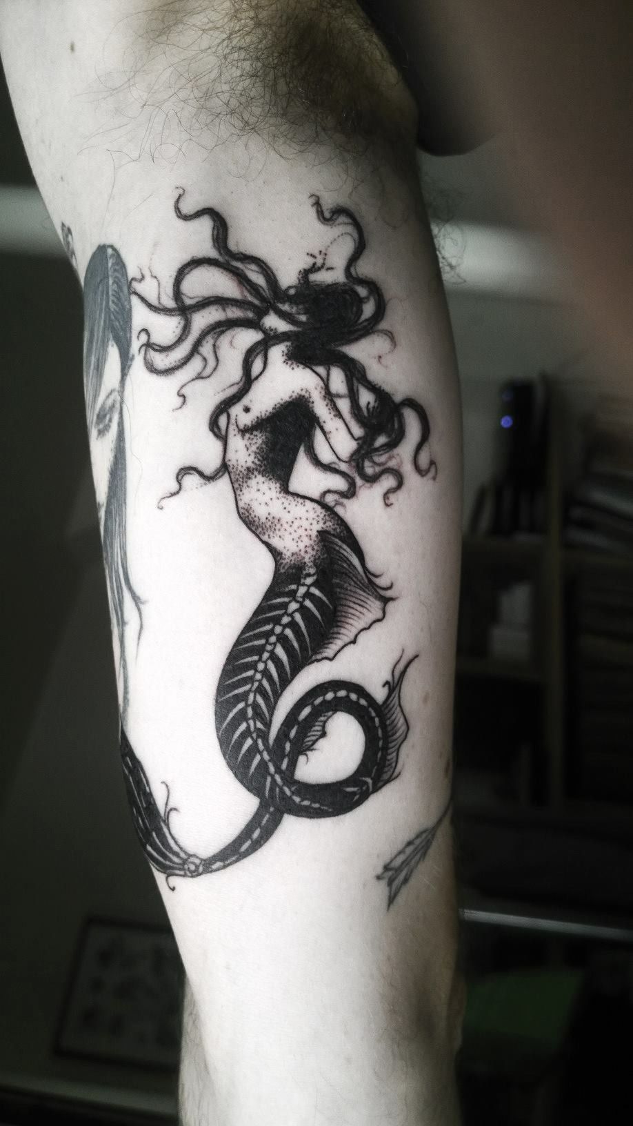 Designs like this appeal to those drawn to gothic symbolism and deeper emotional storytelling. The thigh or calf gives enough space for the vertical composition to feel fluid and powerful. If you want siren tattoo ideas that move beyond beauty into symbolism and transformation, this striking Dark interpretation delivers unforgettable impact.