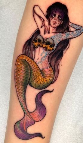 This siren blurs the line between myth and nightmare. The horns and skulls transform her into something almost demonic, yet still undeniably feminine. It’s a Dark mermaid traditional concept that feels bold, fearless, and unapologetically intense.