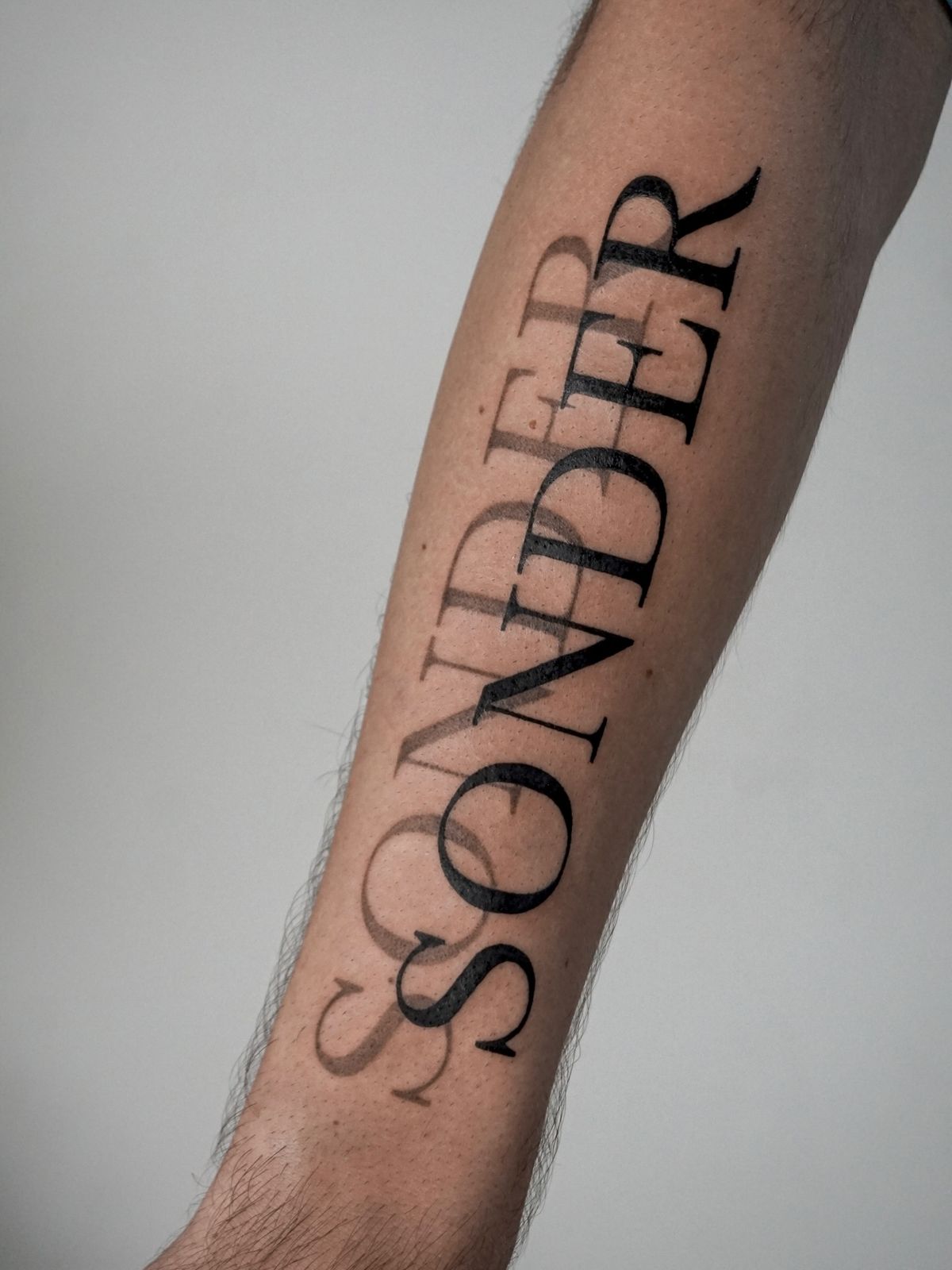 This vertical interpretation of “sonder” feels modern and slightly edgy. It draws the eye naturally along the arm, giving the word movement and rhythm. The spacing and shape make it feel intentional, almost architectural in its simplicity.
