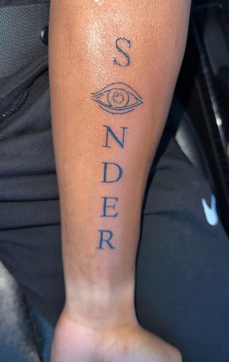 Adding an eye to the word “sonder” instantly shifts the mood. It turns the tattoo into a visual story—awareness, perception, and the quiet realization that everyone around you is living a full, complex life. The eye feels protective and observant, like a pause between thoughts.