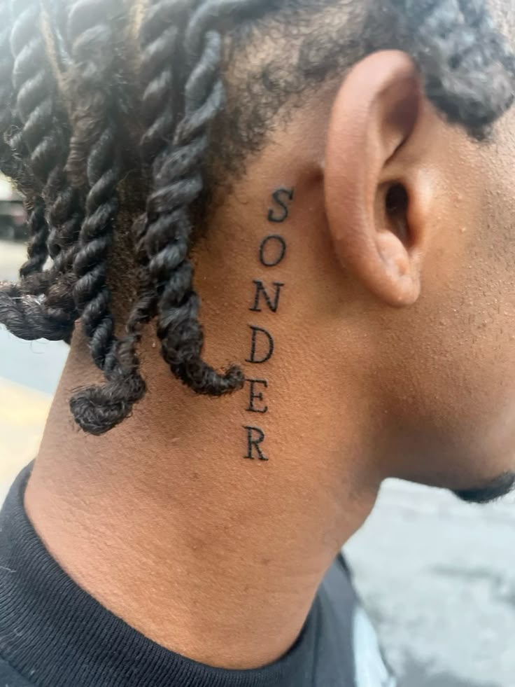 Small, vertical, and tucked just behind the ear, this Sonder tattoo feels like a secret you choose to share selectively. It’s subtle but powerful, especially when revealed through a haircut or tied-back style. There’s an intimacy here that feels very intentional.