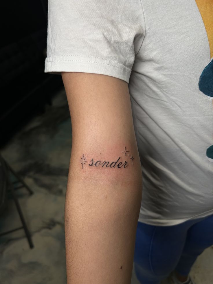 There’s a softness to this tattoo that feels almost dreamy. The small stars framing “sonder” add a hint of wonder, like the word exists in its own little universe. It feels hopeful and light, perfect for someone who connects with the idea of shared humanity in a gentle, optimistic way.