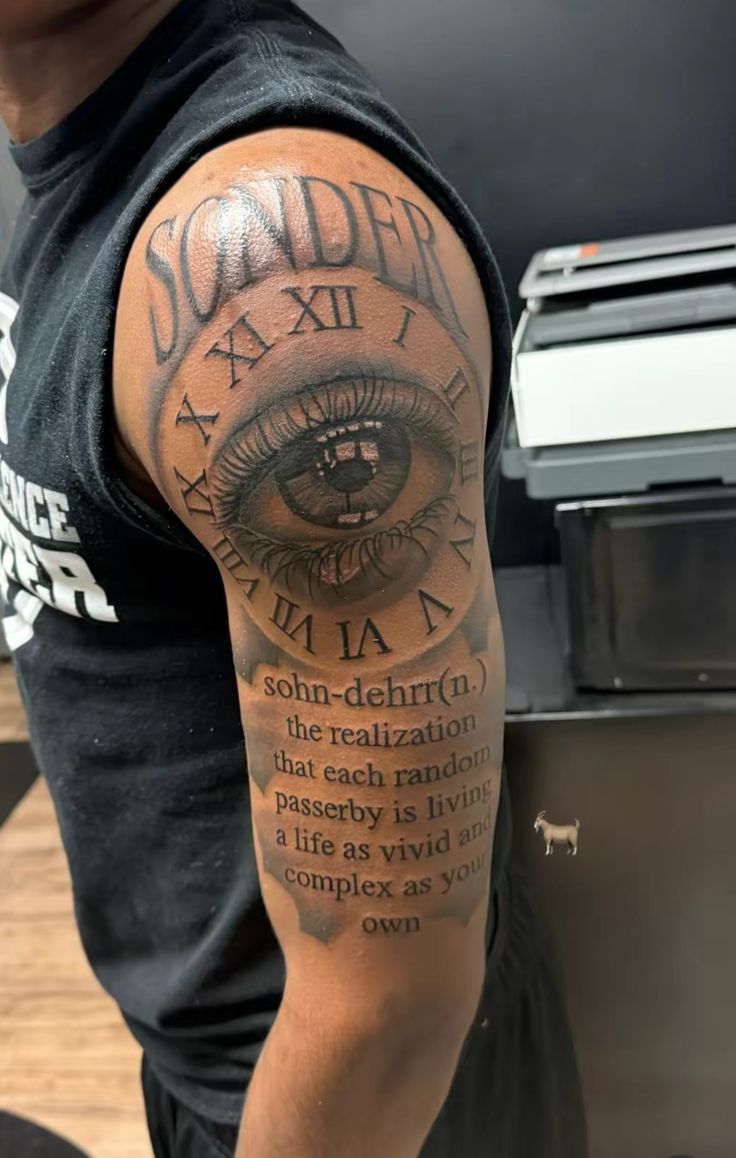 This is sonder on a grand scale—reflective, intellectual, and emotionally rich. Including the definition turns the tattoo into a story rather than a single word, honoring the full significado behind it. The eye and clock imagery add depth, reminding us of time, awareness, and shared humanity.