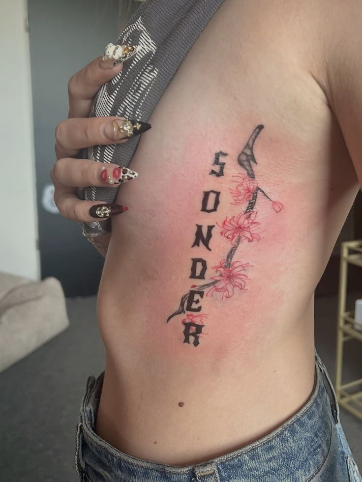 This tattoo blends softness and strength in the most beautiful way. The word “sonder” paired with “flowers” feels symbolic of growth, vulnerability, and emotional depth. The rib placement adds intimacy, making it feel like a private truth you carry close to yourself rather than something meant for everyone’s eyes.