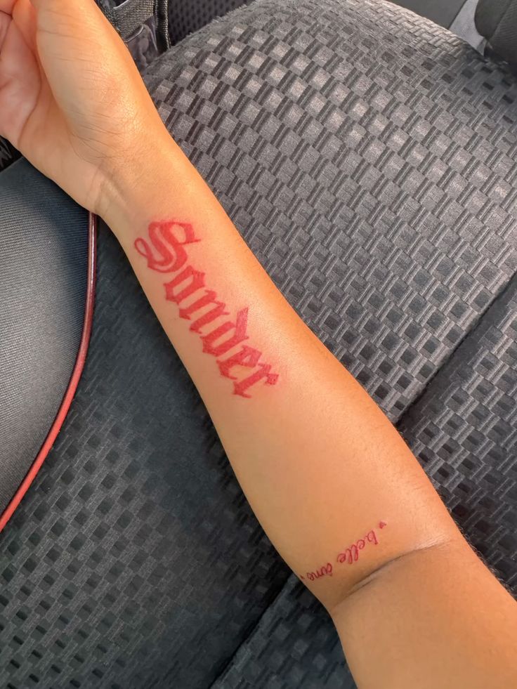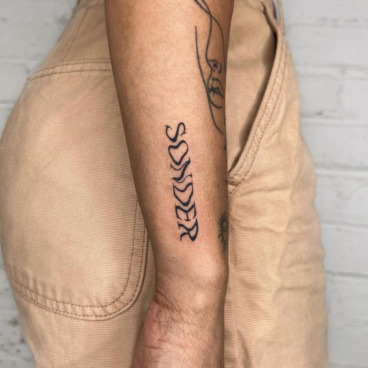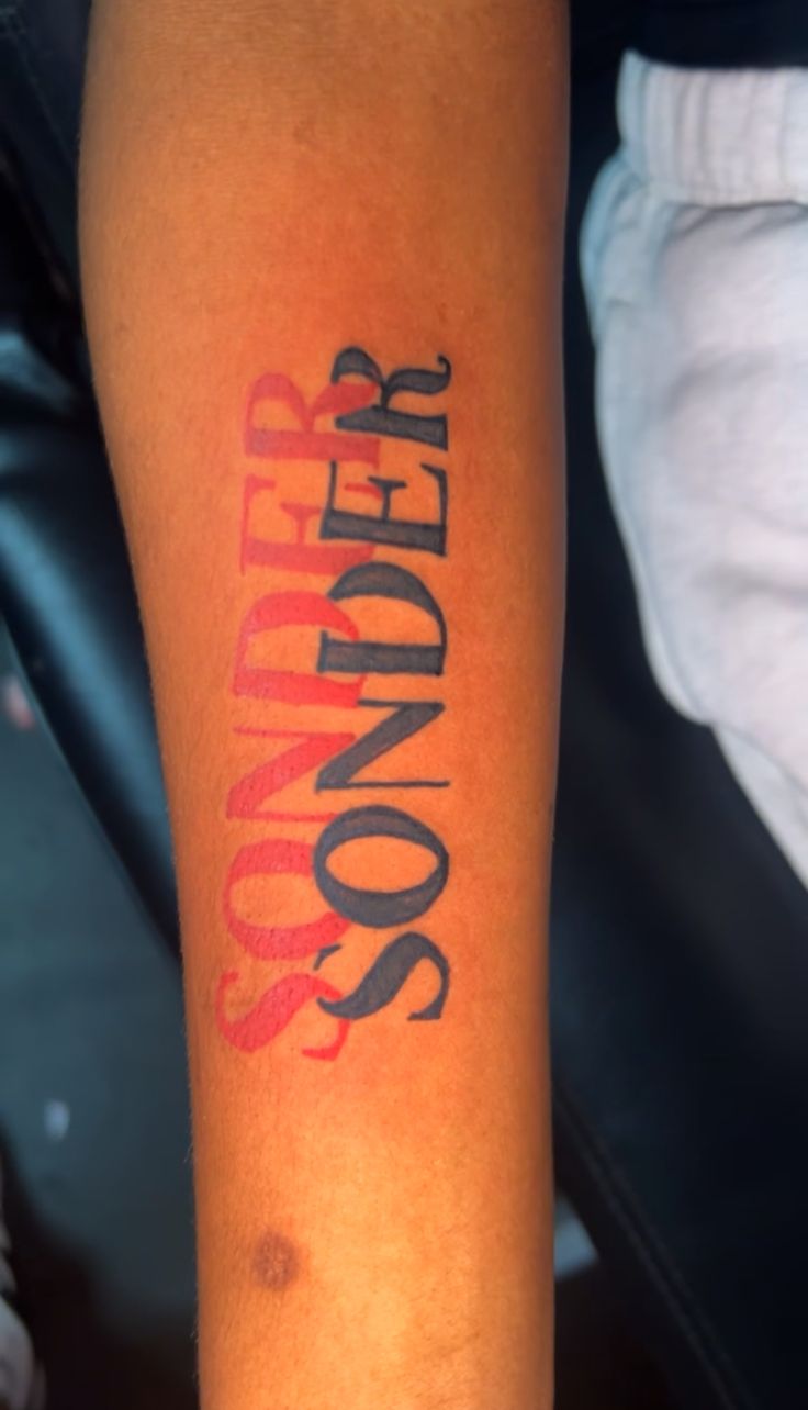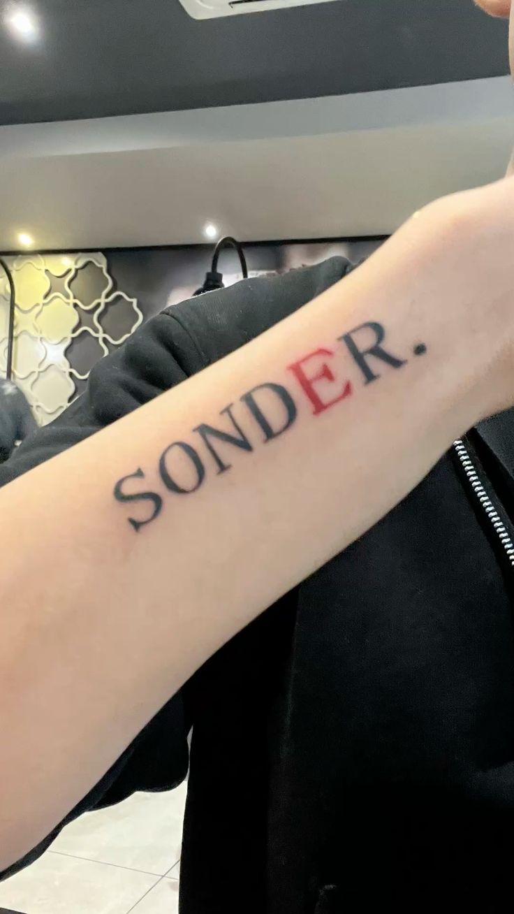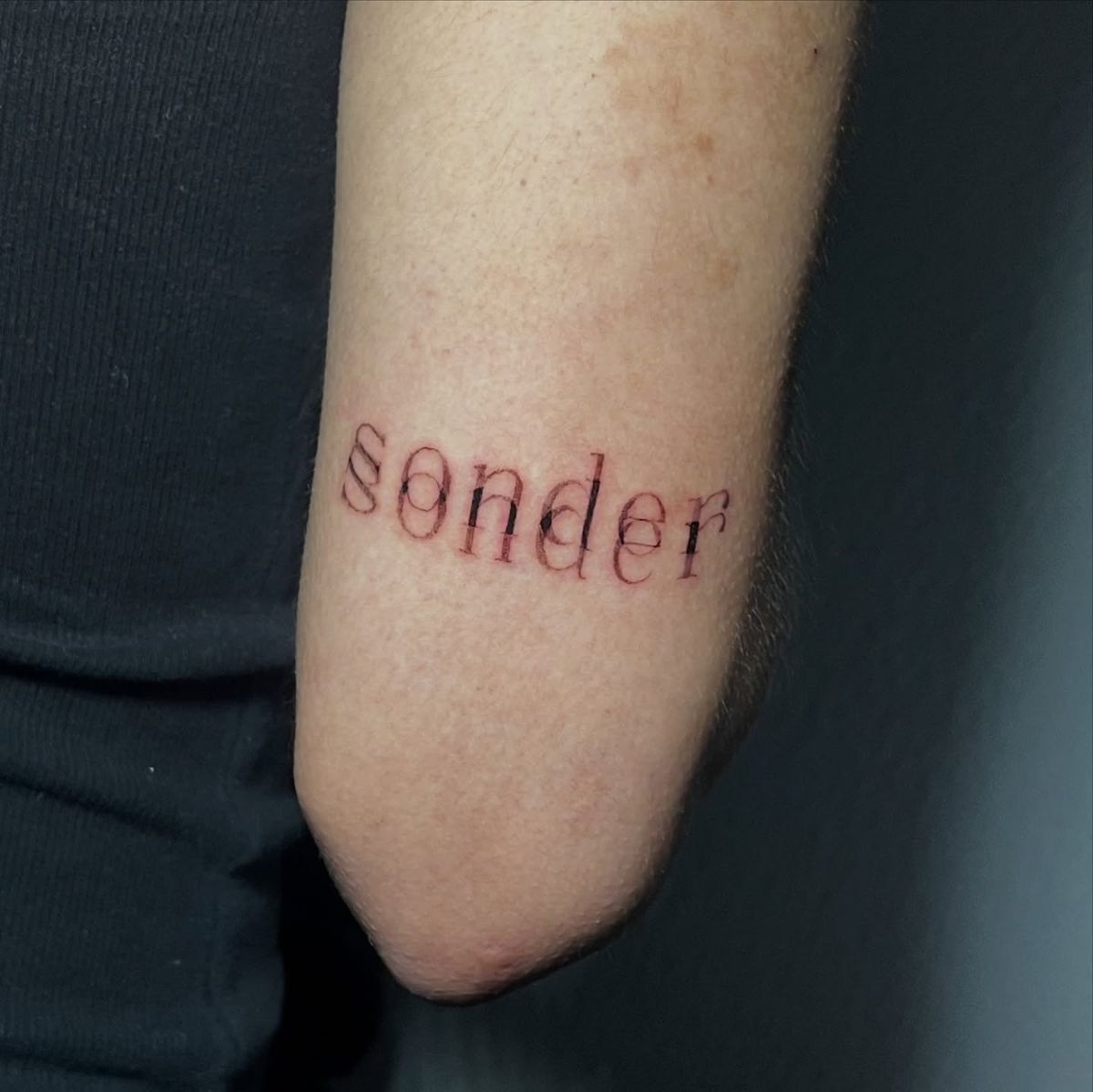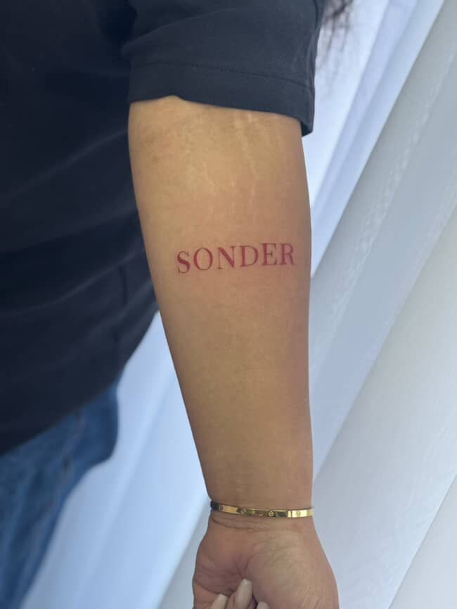 This version of “sonder” feels calm and quietly self-assured. The red ink softens the word just enough to make it feel emotional without tipping into drama. It reads like a gentle reminder rather than a declaration, the kind of tattoo that feels deeply personal even when it’s visible. There’s something reassuring about its simplicity, like it’s grounding you in moments when the world feels a little loud.