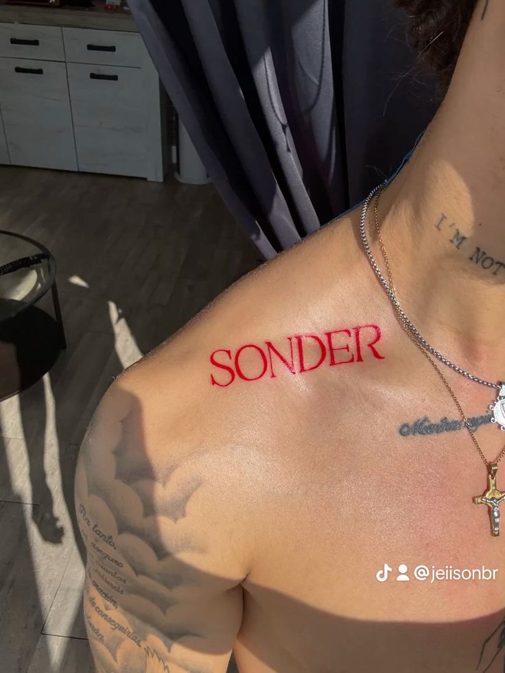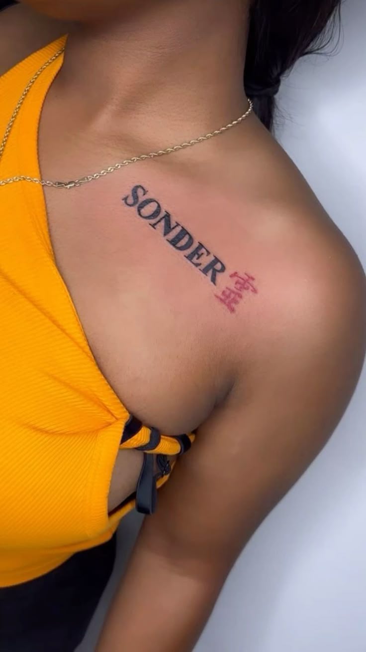 This tattoo feels bold in the most confident, self-possessed way. Placed high on the chest, sonder becomes something you wear with pride—visible, intentional, and emotionally charged. The small red symbol detail adds an extra layer of story, like a quiet underline to the word’s meaning, hinting that there’s more beneath the surface than what people first see.