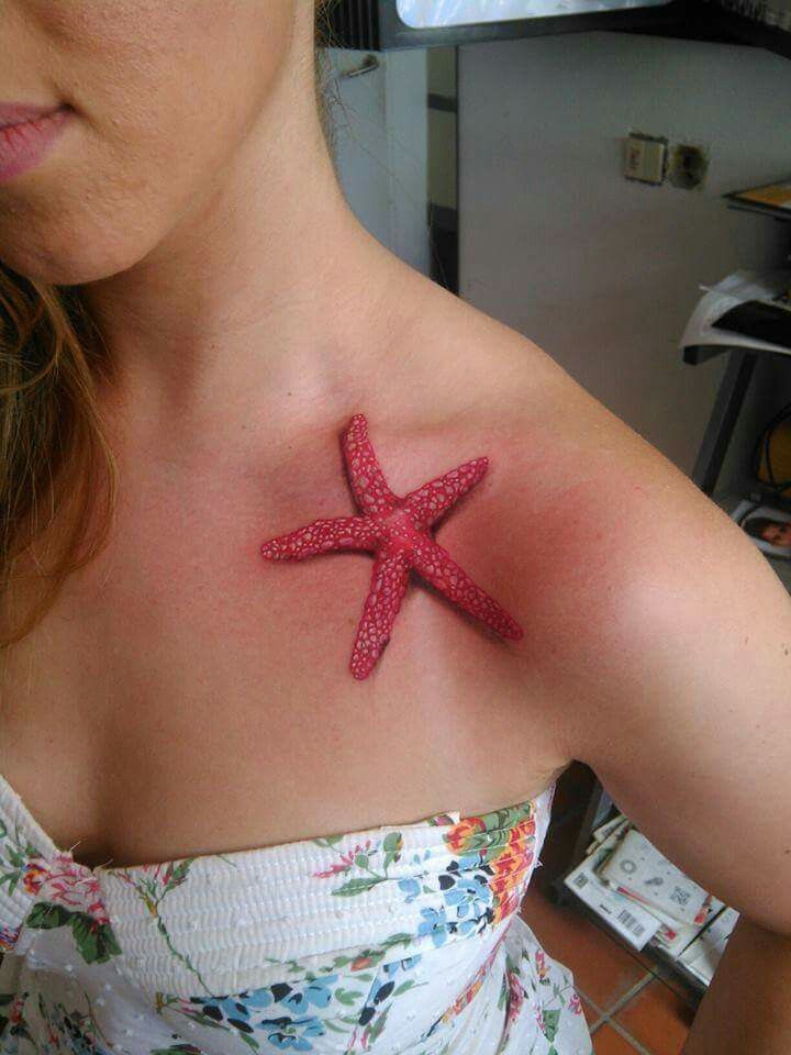 This tattoo has such a playful, beachy confidence to it. The bright pink tone and textured realism make the starfish feel almost lifted straight from the shoreline and placed gently across the collarbone. It is feminine, flirty, and definitely eye-catching, but it still keeps that organic ocean beauty that makes the motif so timeless. Among starfish tattoo ideas, this one feels especially summery and bold in a carefree way. It is the kind of design that turns a bare shoulder, a strappy dress, or a swimsuit neckline into a full look without needing anything else.