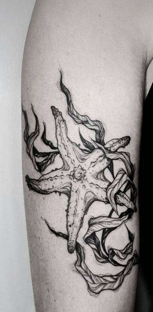 This piece is pure drama in the most elegant way. The starfish already has strong texture and shape, but those flowing, ribbon-like strands around it give the entire design movement, like it is drifting underwater in slow motion. It feels artistic, slightly moody, and beautifully immersive. If you tend to prefer tattoos that tell more of a story, this is one of those starfish tattoo ideas that really draws you in. It does not feel decorative for decoration’s sake. It feels atmospheric, like a full scene distilled into one graceful black and grey composition.